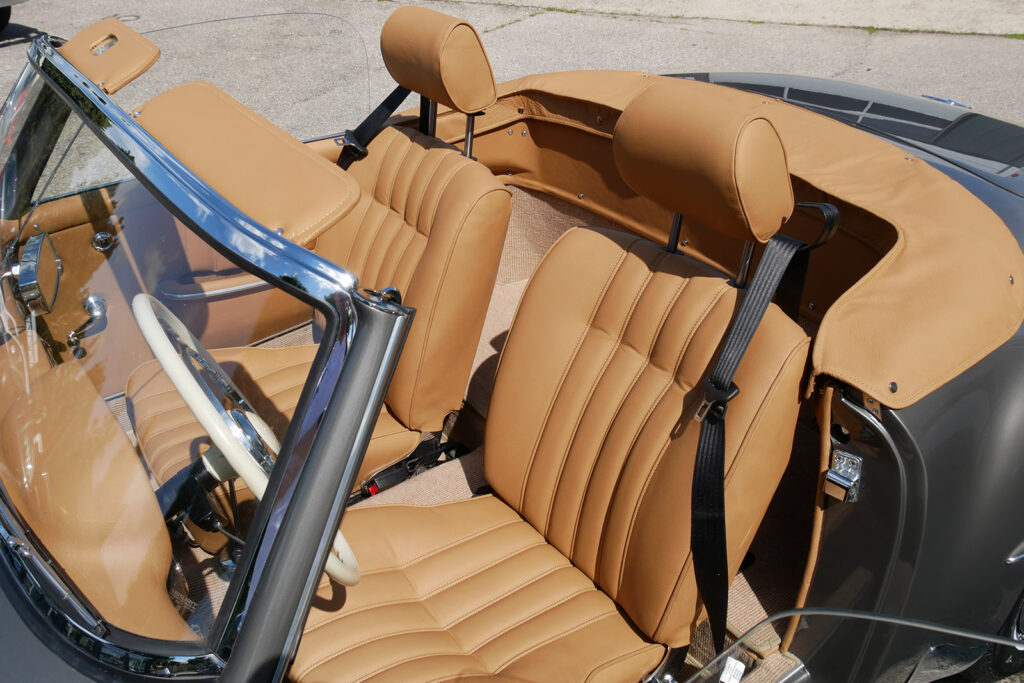 Mit dem modernen Straßenverkehr und auch der Anschnallpflicht stieg auch der Sicherheitsanspruch. Natürlich dürfen wir in einem 190 SL wie damals ohne Sicherheitsgurte fahren. Der ein oder andere fühlt sich aber unwohl und möchte mehr Sicherheit für Beifahrer und Fahrer. Wir verbauen aus diesen Gründen schon lange Sicherheitsgurte in unterschiedlichen Ausführungen in den SLs unserer Kunden. Es gibt bei uns zwei Varianten: Beckengurte oder Dreipunktgurte mit nachgerüsteten Kopfstützen.