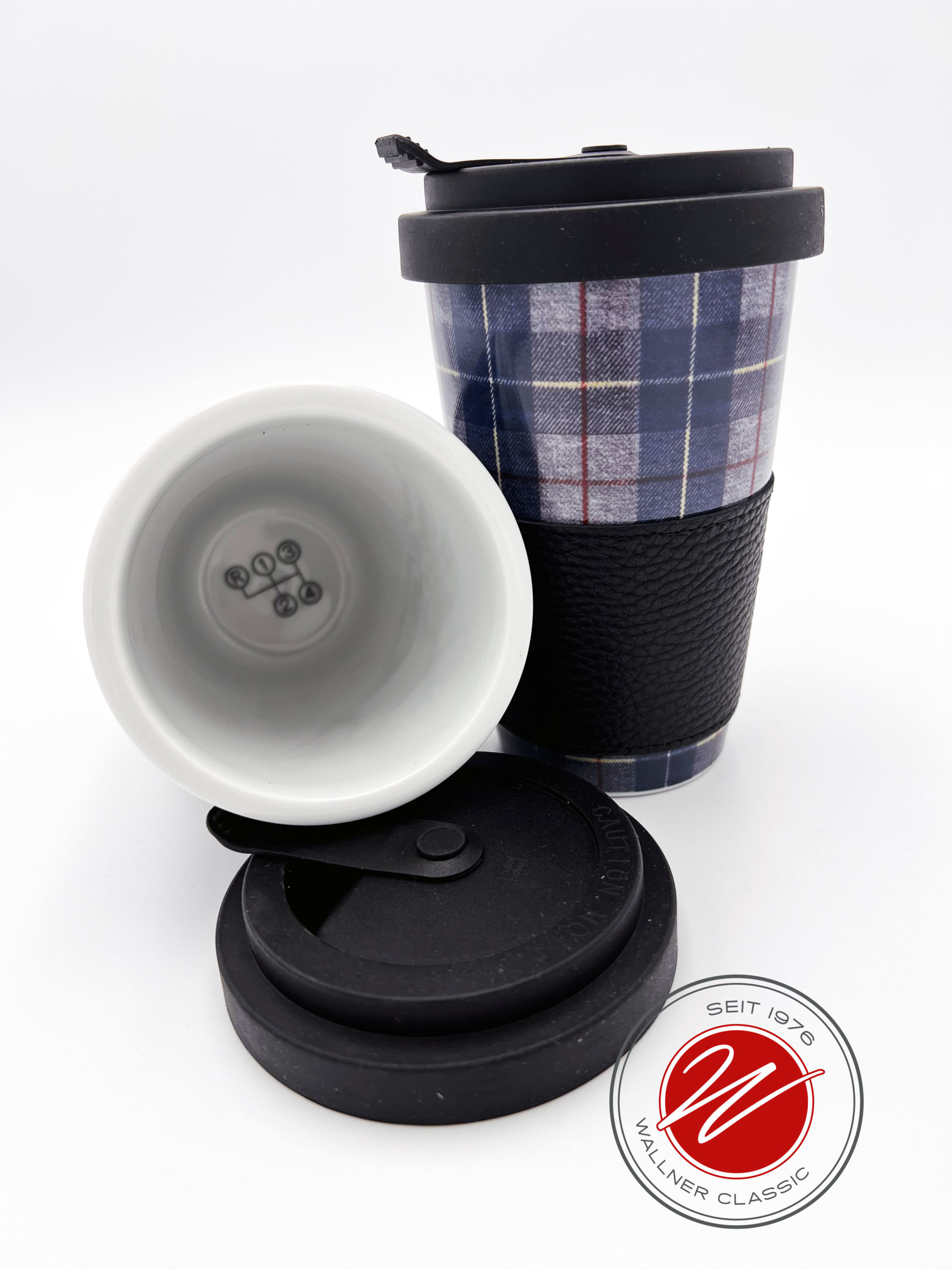 Die Muster historischer Stoffe auf echtem Porzellan (100% klimaneutral) gepaart mit einer Banderole aus feinem Leder werden besonders die Automobil-Enthusiasten begeistern. Dazu ein farblich perfekt abgestimmter und auslaufsicherer Deckel, der aus trinkfreundlichem Elastomer ohne Weichmacher und Silikone hergestellt wird und spülmaschinenfest ist.