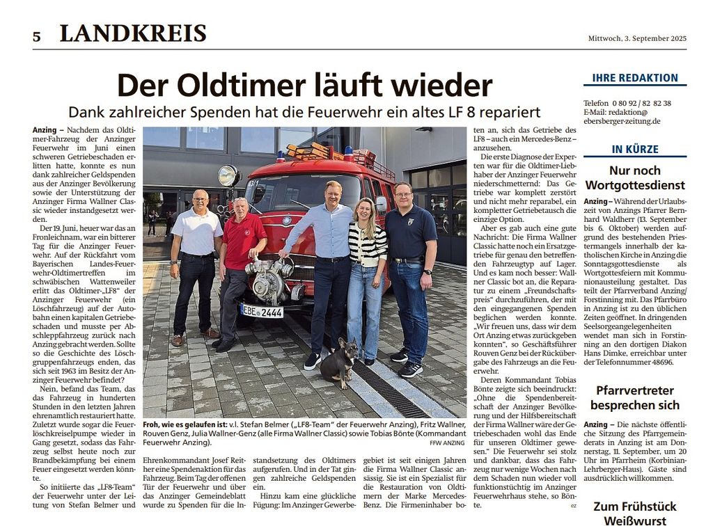 Der Münchner Merkur hat über die Anzinger Oldtimer Feuerwehr LF8 und uns berichtet. Wir freuen uns sehr über die Wertschätzung und Aufmerksamkeit. Für uns eine Ehre, die Anzinger Feuerwehr unterstützen zu dürfen!