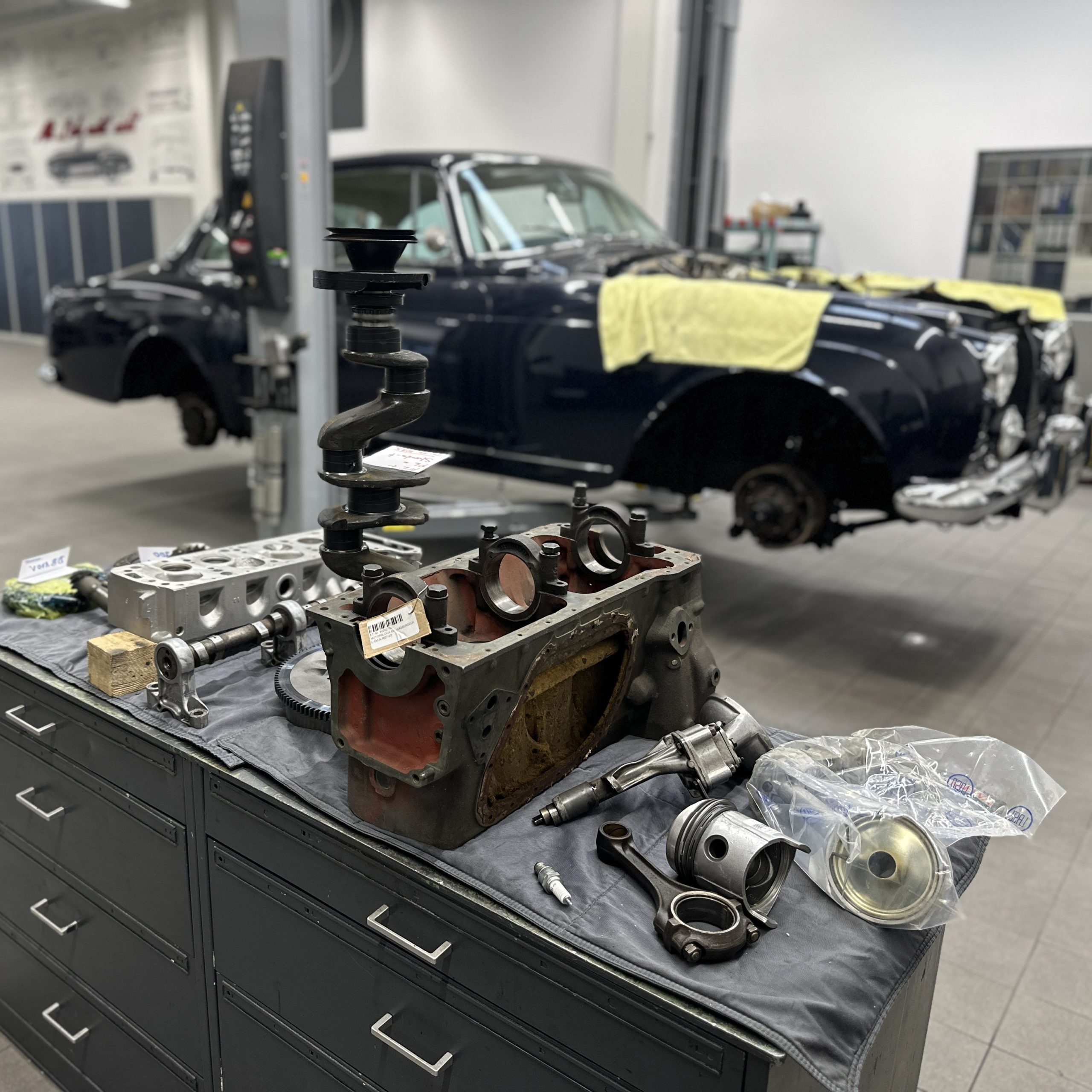 Nach einem kurzen Get-Togehter inklusive kleiner Stärkung in unserem Showroom, starteten wir direkt mit unserem ca. drei-stündigen Workshop. Das Team von WALLNER Classic präsentierte an einer Werkbank unserer Werkstatt verschiedene Bauteile, wie Motorblock, Nockenwelle, Pleuel und Kolben.